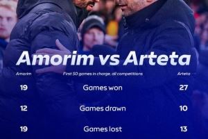 阿莫林执教曼联前50场vs阿尔特塔阿森纳前50场:后者战绩全面占优