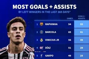 五大联赛左边锋近一年参与进球:拉菲尼亚55球最多,伊尔迪兹第六