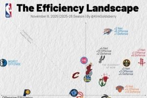 - 2025-11-07本赛季效率值图表:火箭&雷霆净效率前二 独行侠进攻垫底