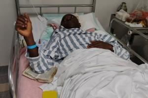 10月9日,老乡阿布(左)在病房探望术后的阿萨莫阿/广西医科大学第一附属医院脊柱骨病外科供图