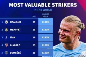 中锋德转身价排行:哈兰德、姆巴佩1.8亿欧最高,伊萨克1.4亿欧