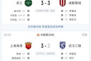 体育资讯09月26日讯 中超第26轮,蓉城3-3遭浙江绝平,海港3-2绝杀三镇,海港2分领跑积分榜。
