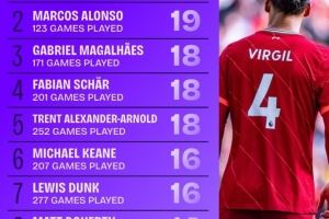 1、范戴克:257场21球